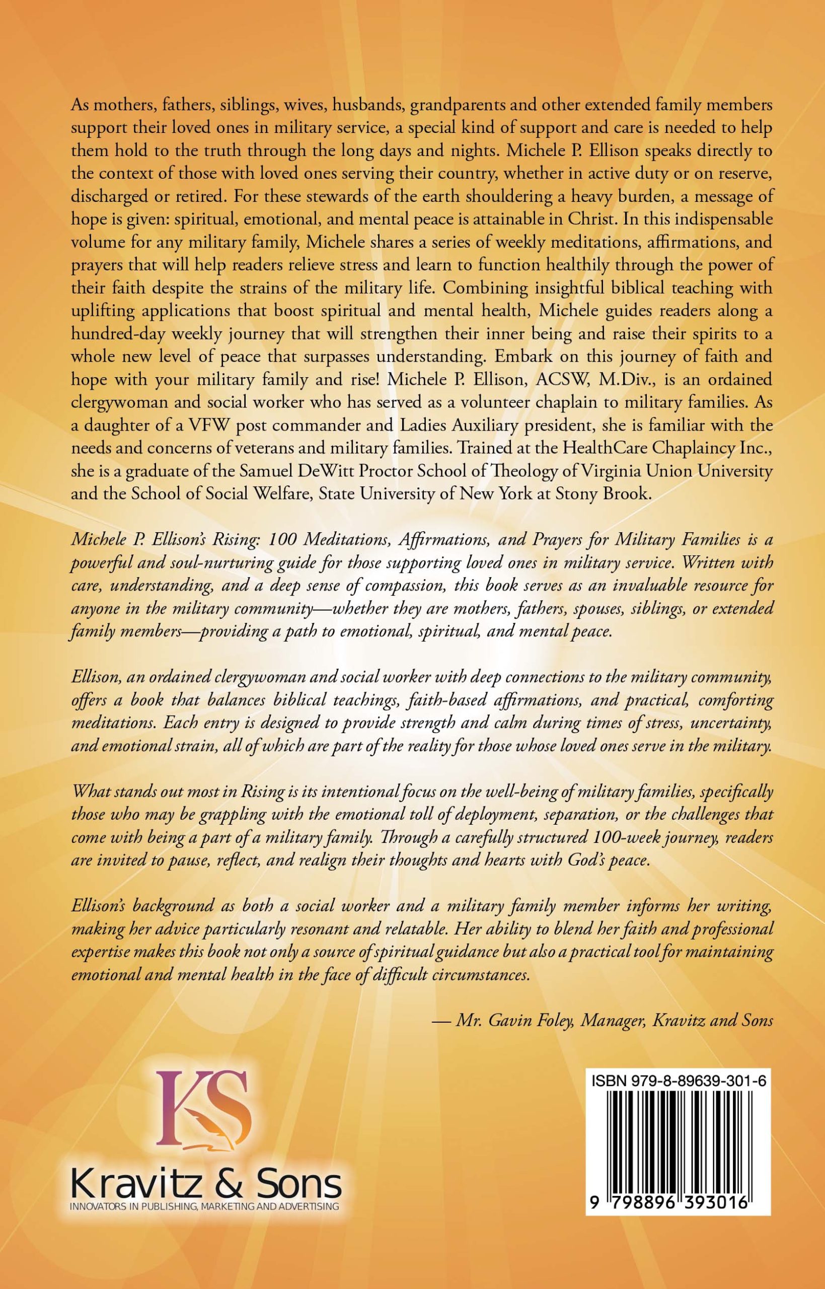 As mothers, fathers, siblings, wives, husbands, grandparents and other extended family members support their loved ones in military service, a special kind of support and care is needed to help them hold to the truth through the long days and nights. Michele P. Ellison speaks directly to the context of those with loved ones serving their country, whether in active duty or on reserve, discharged or retired. For these stewards of the earth shouldering a heavy burden, a message of hope is given: spiritual, emotional, and mental peace is attainable in Christ. In this indispensable volume for any military family, Michele shares a series of weekly meditations, affirmations, and prayers that will help readers relieve stress and learn to function healthily through the power of their faith despite the strains of the military life. Combining insightful biblical teaching with uplifting applications that boost spiritual and mental health, Michele guides readers along a hundred-day weekly journey that will strengthen their inner being and raise their spirits to a whole new level of peace that surpasses understanding. Embark on this journey of faith and hope with your military family and rise! Michele P. Ellison, ACSW, M.Div., is an ordained clergywoman and social worker who has served as a volunteer chaplain to military families. As a daughter of a VFW post commander and Ladies Auxiliary president, she is familiar with the needs and concerns of veterans and military families. Trained at the HealthCare Chaplaincy Inc., she is a graduate of the Samuel DeWitt Proctor School of Theology of Virginia Union University and the School of Social Welfare, State University of New York at Stony Brook.